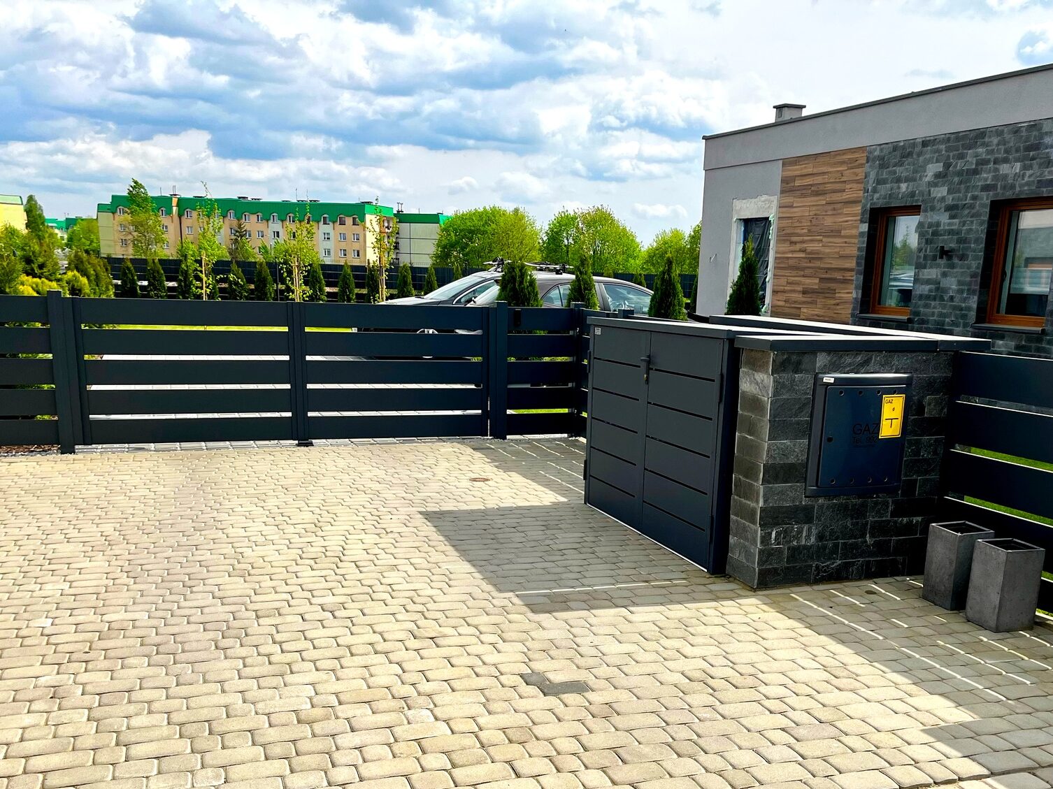 To tutaj swoją rolę odgrywa słupek multimedialny. To szeroki, minimalistyczny element konstrukcyjny, w którym chowa się nie tylko skrzynkę na listy i paczki, ale także wideodomofon, klawiaturę kodową czy oświetlenie numeru posesji. Taka personalizacja sprawia, że front posesji jest czysty, uporządkowany i naszpikowany technologią, która dba o funkcjonalność i bezpieczeństwo. Wszystkie kable i systemy elektroniczne są ukryte wewnątrz słupka, co chroni je przed warunkami atmosferycznymi i zapewnia wyjątkowy charakter instalacji.